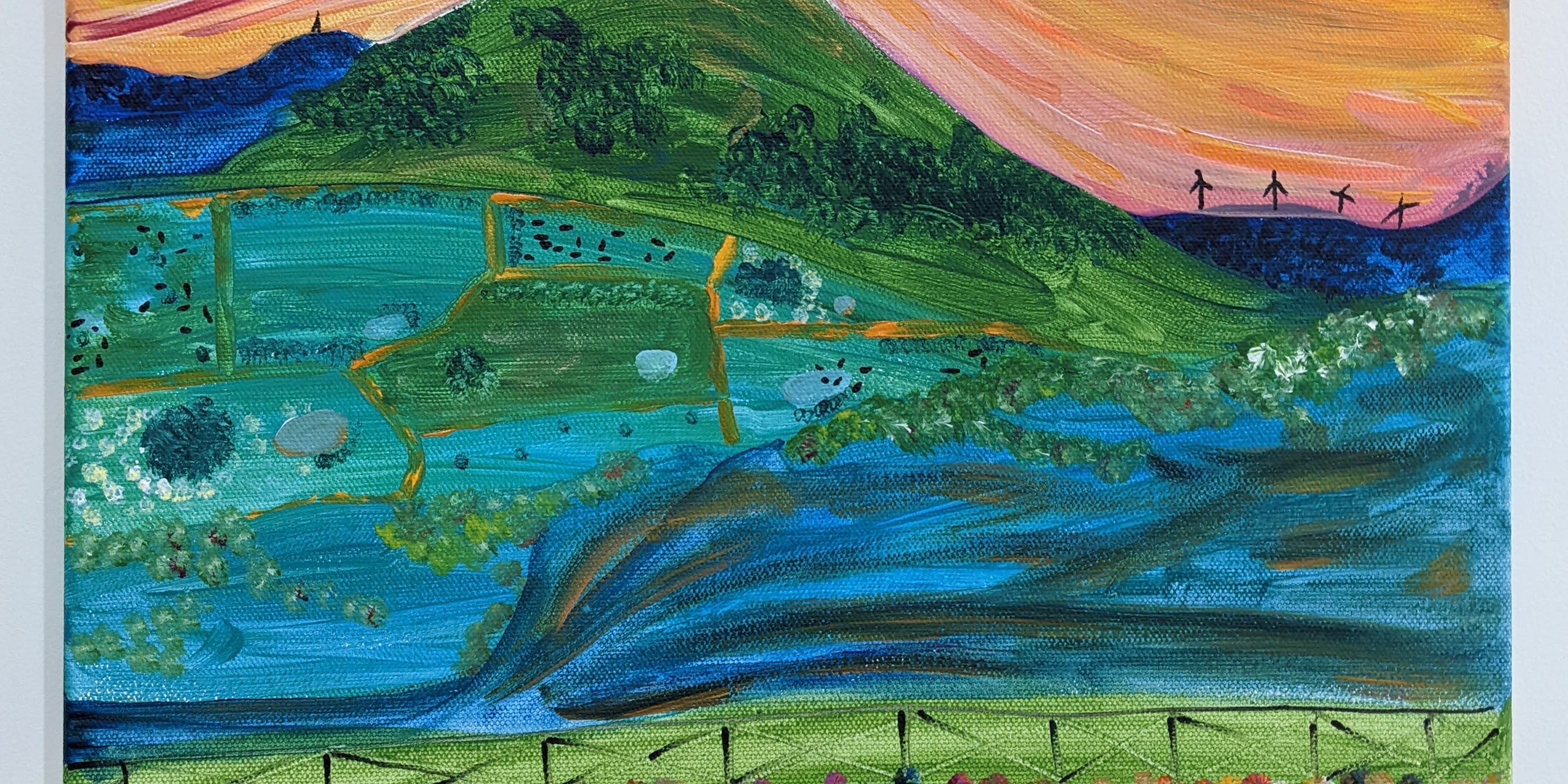 This painting depicts the view we have over my family farm from the house. This farm in years to come will be handed down to me. In this painting, I wanted to capture how I feel about the farm and how I want to see it in the future. I want to walk up to beautiful sunrises, be surrounded by a colourfully garden, tend to heathy livestock, struggle to walk through lushes diverse pastures and enjoy looking at the sunset over this beautiful landscape each afternoon.