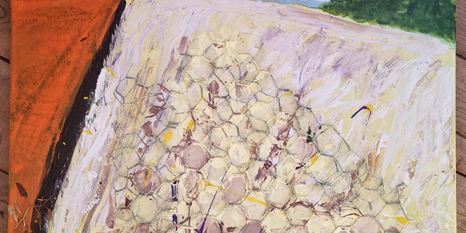This mixed media work is inspired by an empty paddock after haymaking – filled with the remnant textures and colours of the old and the new, found in late spring in Gundagai.
