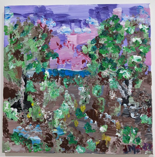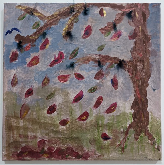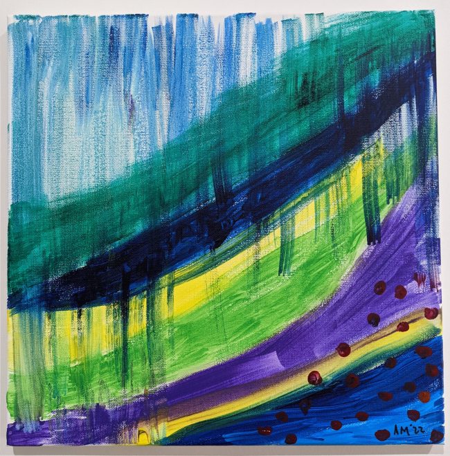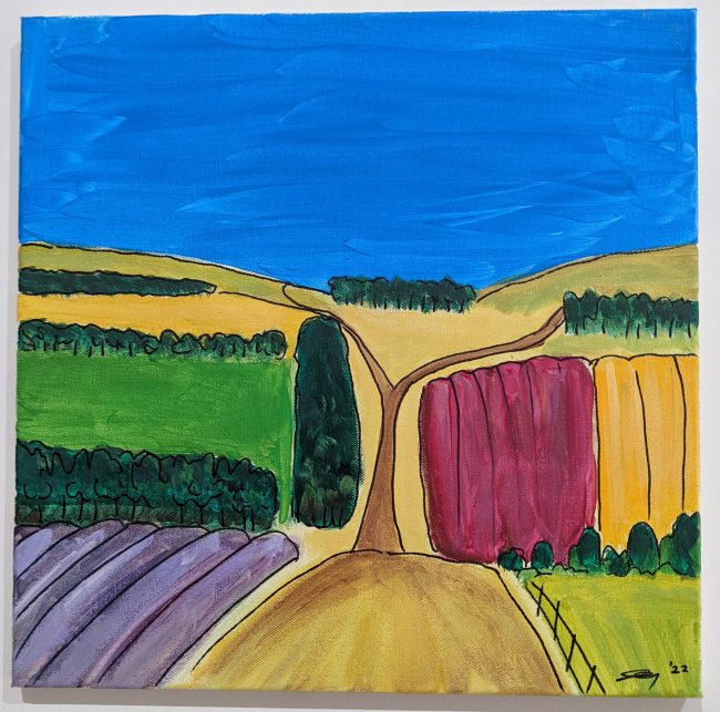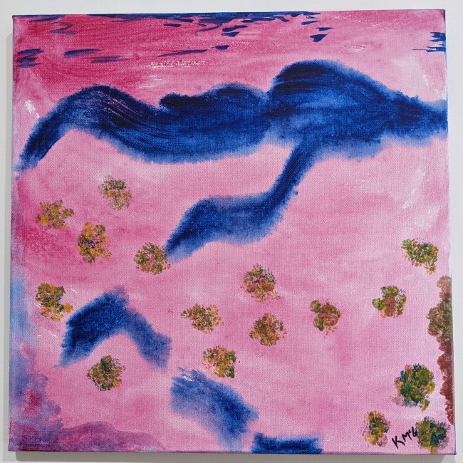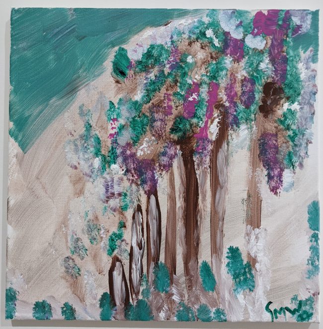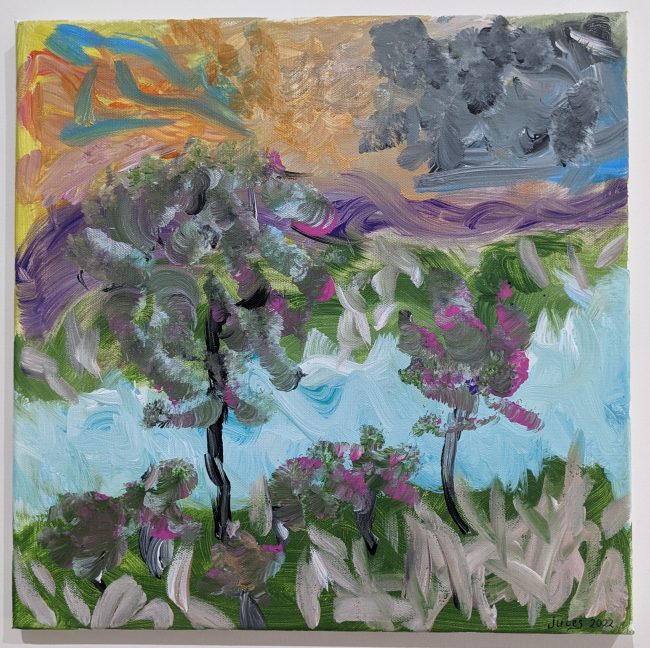 “Trees On The Farm” The feelings I had while putting paint on the canvas, was that I felt like I was walking down the hill after a big walk up the hill with lungs full of air and joy in my heart! Created by: Genevieve Wakem on the 22/5/2022 at Coolac Hall