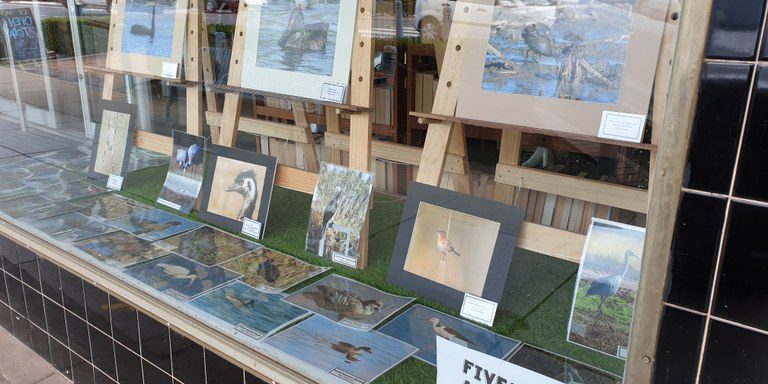 This project aimed to raise the profile of Fivebough Wetlands, helping Leeton find greater pride in the site. A local artist designed a banner for Fivebough which features local and migratory birds who call Fivebough home. This banner featured in the Op Shop window along with photos from Murrumbidgee Field Naturalists and Murrumbidgee Landcare encouraging local people to visit Fivebough to gain confidence in identifying wetland birds. On completion of the information session, the artwork was moved to the display cases at Fivebough Wetlands.