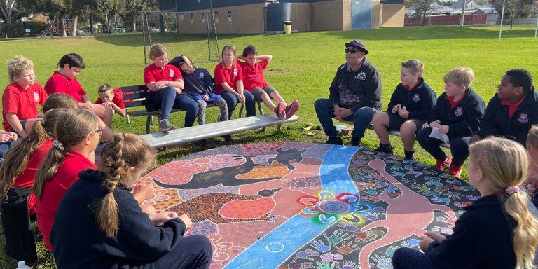 Murrumbidgee Landcare also worked with Hay and Booligal Public Schools to create cultural learning spaces with yarning circles at the centre. Connected by sitting around the yarning circles, students can come together to learn, talk and share ideas as equals in a safe place without any judgment. These projects provided a way for Aboriginal artists and organisations to connect with the wider community, introduce art and culture to school students, and provide ongoing reflection about the relationships between Aboriginal and non-Aboriginal people.